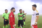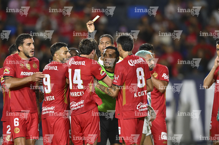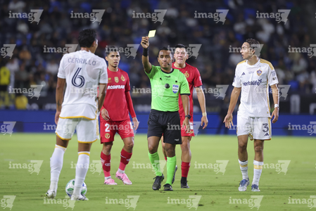 Carson, California, Estados Unidos, 1 de octubre de 2025. Iván Bartón muestra tarjeta amarilla de amonestación a Marcel Ruiz, durante el partido correspondiente al Campeones Cup 2025, entre el LA Galaxy y los Diablos Rojos del Toluca, realizado en el Dignity Health Sports Park. Foto: Imago7/ Etzel Espinosa