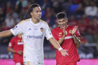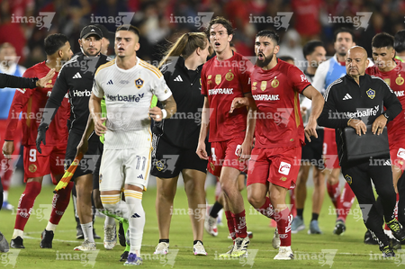 Carson, California, Estados Unidos, 1 de octubre de 2025. Marcel Ruiz y Bruno Mendez en conato de bronca, durante el partido correspondiente al Campeones Cup 2025, entre el LA Galaxy y los Diablos Rojos del Toluca, realizado en el Dignity Health Sports Park. Foto: Imago7/ Etzel Espinosa