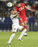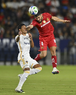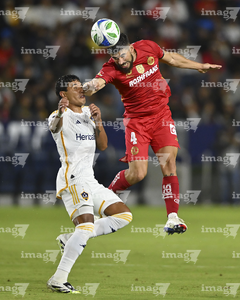 Carson, California, Estados Unidos, 1 de octubre de 2025. Paulinho y Harbor Miller, durante el partido correspondiente al Campeones Cup 2025, entre el LA Galaxy y los Diablos Rojos del Toluca, realizado en el Dignity Health Sports Park. Foto: Imago7/ Rafael Vadillo