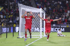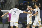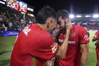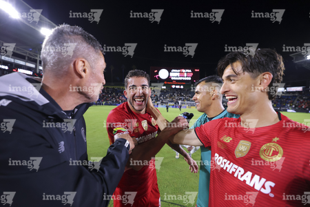 Carson, California, Estados Unidos, 1 de octubre de 2025. Luis García recibe gol de Diego Fagundez, durante el partido correspondiente al Campeones Cup 2025, entre el LA Galaxy y los Diablos Rojos del Toluca, realizado en el Dignity Health Sports Park. Foto: Imago7/ Rafael Vadillo