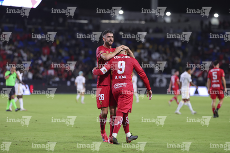 Carson, California, Estados Unidos, 1 de octubre de 2025. Alexis Vega y Nicolás Castro en festejo de gol, durante el partido correspondiente al Campeones Cup 2025, entre el LA Galaxy y los Diablos Rojos del Toluca, realizado en el Dignity Health Sports Park. Foto: Imago7/ Etzel Espinosa