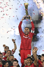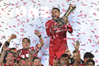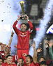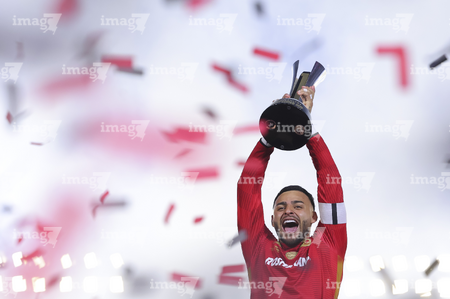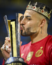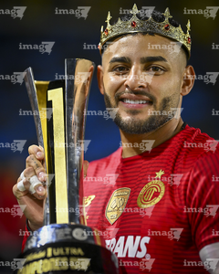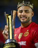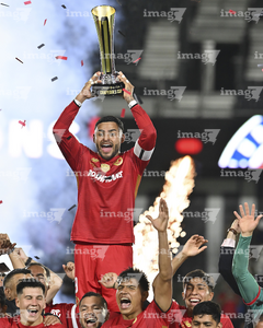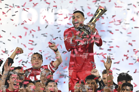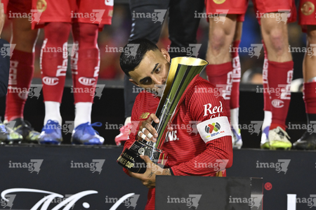 Carson, California, Estados Unidos, 1 de octubre de 2025. Alexis Vega en festejo con el trofeo de campeón, durante el partido correspondiente al Campeones Cup 2025, entre el LA Galaxy y los Diablos Rojos del Toluca, realizado en el Dignity Health Sports Park. Foto: Imago7/ Etzel Espinosa