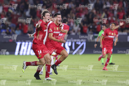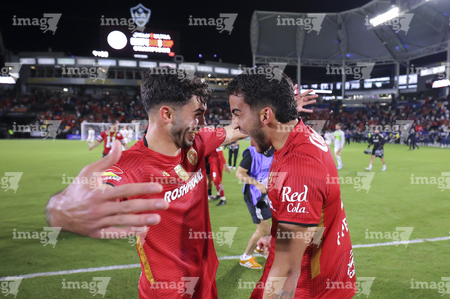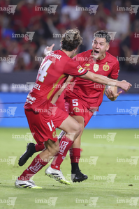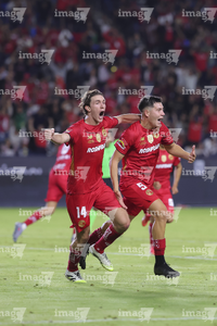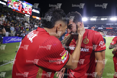 Carson, California, Estados Unidos, 1 de octubre de 2025. Federico Pereira y Fernando Arce en festejo, durante el partido correspondiente al Campeones Cup 2025, entre el LA Galaxy y los Diablos Rojos del Toluca, realizado en el Dignity Health Sports Park. Foto: Imago7/ Rafael Vadillo