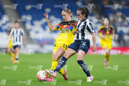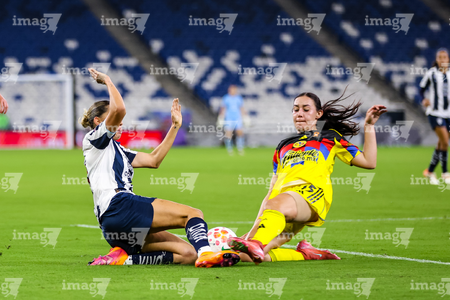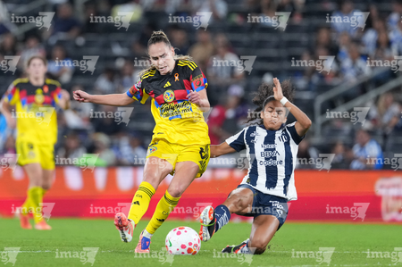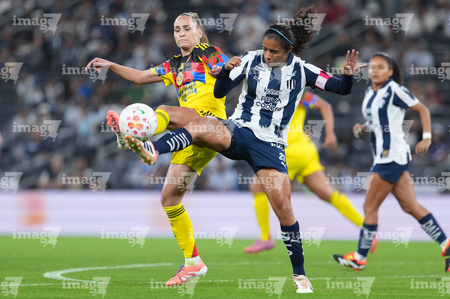 Guadalupe, Nuevo León, 6 de noviembre de 2025. Emily Gielnik y Annia Mejía, durante el partido correspondiente a la ida de los Cuartos de Final del torneo Apertura 2025 de la Liga BBVA MX Femenil, entre las Rayadas del Monterrey y las Águilas del América, realizado en el estadio BBVA. Foto: Imago7/ Nora Guerrero