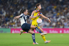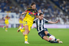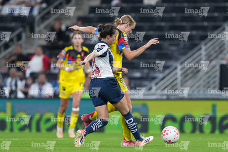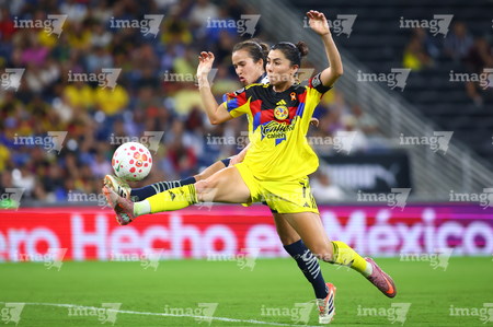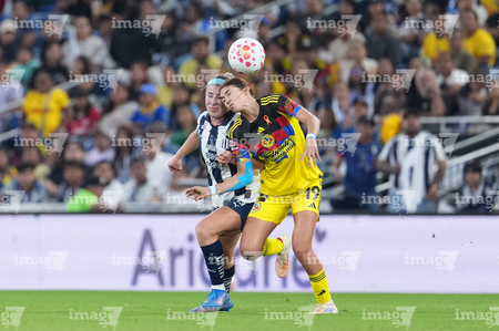 Guadalupe, Nuevo León, 6 de noviembre de 2025. Annia Mejía y Emily Gielnik, durante el partido correspondiente a la ida de los Cuartos de Final del torneo Apertura 2025 de la Liga BBVA MX Femenil, entre las Rayadas del Monterrey y las Águilas del América, realizado en el estadio BBVA. Foto: Imago7/ Nora Guerrero