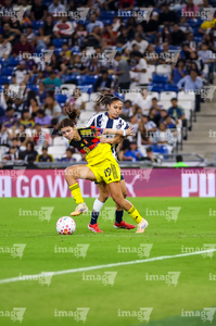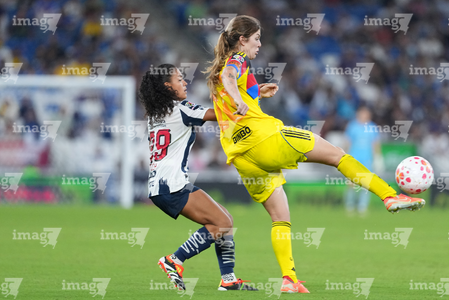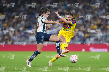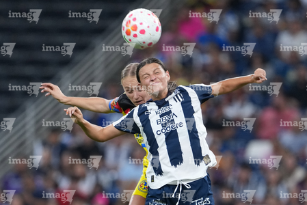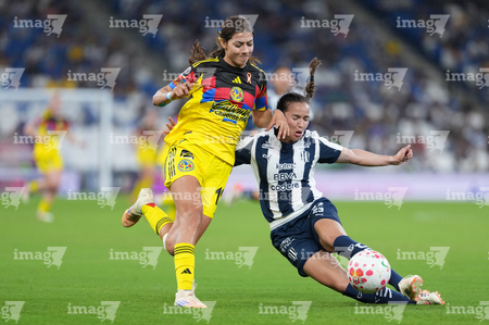 Guadalupe, Nuevo León, 6 de noviembre de 2025. Lucía García y Jana Gutiérrez, durante el partido correspondiente a la ida de los Cuartos de Final del torneo Apertura 2025 de la Liga BBVA MX Femenil, entre las Rayadas del Monterrey y las Águilas del América, realizado en el estadio BBVA. Foto: Imago7/David Arzamendi