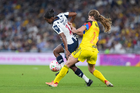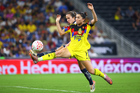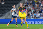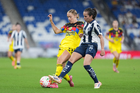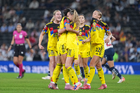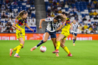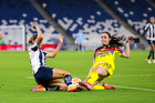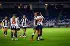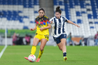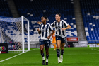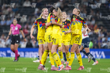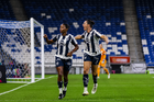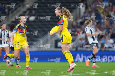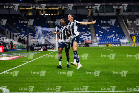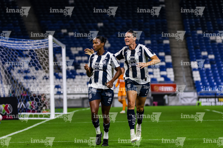 Guadalupe, Nuevo León, 6 de noviembre de 2025. Jermaine Seoposenwe y Emily Gielnik en festejo de gol, durante el partido correspondiente a la ida de los Cuartos de Final del torneo Apertura 2025 de la Liga BBVA MX Femenil, entre las Rayadas del Monterrey y las Águilas del América, realizado en el estadio BBVA. Foto: Imago7/ Nora Guerrero