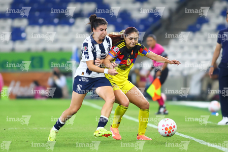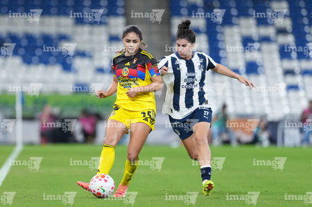 Guadalupe, Nuevo León, 6 de noviembre de 2025. Karol Bernal y Montserrat Saldivar, durante el partido correspondiente a la ida de los Cuartos de Final del torneo Apertura 2025 de la Liga BBVA MX Femenil, entre las Rayadas del Monterrey y las Águilas del América, realizado en el estadio BBVA. Foto: Imago7/ Andrea Jiménez