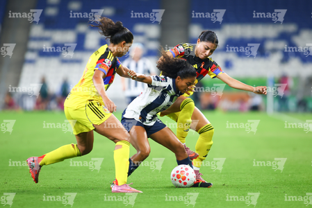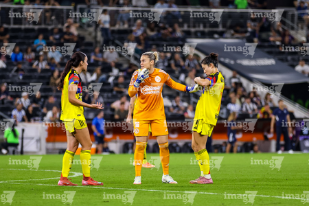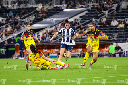 Guadalupe, Nuevo León, 6 de noviembre de 2025. Annia Mejía, Lourdes Bosch y Nancy Antonio, durante el partido correspondiente a la ida de los Cuartos de Final del torneo Apertura 2025 de la Liga BBVA MX Femenil, entre las Rayadas del Monterrey y las Águilas del América, realizado en el estadio BBVA. Foto: Imago7/David Arzamendi