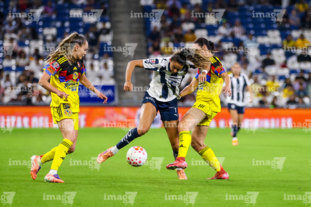 Guadalupe, Nuevo León, 6 de noviembre de 2025. Kimberly Rodríguez ,Lucía García y Annia Mejía, durante el partido correspondiente a la ida de los Cuartos de Final del torneo Apertura 2025 de la Liga BBVA MX Femenil, entre las Rayadas del Monterrey y las Águilas del América, realizado en el estadio BBVA. Foto: Imago7/ Nora Guerrero