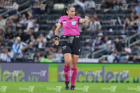 Guadalupe, Nuevo León, 6 de noviembre de 2025. Priscila Pérez Borja, árbitra central, durante el partido correspondiente a la ida de los Cuartos de Final del torneo Apertura 2025 de la Liga BBVA MX Femenil, entre las Rayadas del Monterrey y las Águilas del América, realizado en el estadio BBVA. Foto: Imago7/ Andrea Jiménez