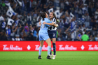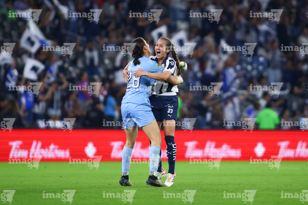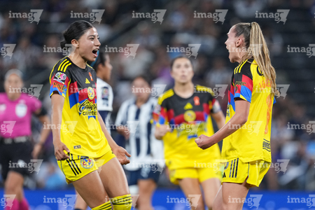 Guadalupe, Nuevo León, 6 de noviembre de 2025. Paola Manrique y Valeria Del Campo en festejo, durante el partido correspondiente a la ida de los Cuartos de Final del torneo Apertura 2025 de la Liga BBVA MX Femenil, entre las Rayadas del Monterrey y las Águilas del América, realizado en el estadio BBVA. Foto: Imago7/David Arzamendi