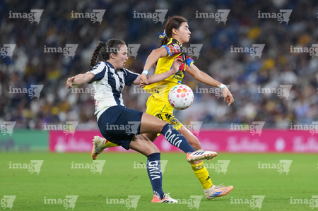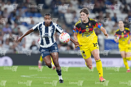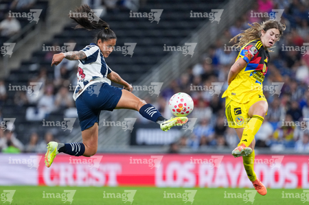 Guadalupe, Nuevo León, 6 de noviembre de 2025. Valeria Del Campo y Montserrat Saldivar, durante el partido correspondiente a la ida de los Cuartos de Final del torneo Apertura 2025 de la Liga BBVA MX Femenil, entre las Rayadas del Monterrey y las Águilas del América, realizado en el estadio BBVA. Foto: Imago7/ Andrea Jiménez