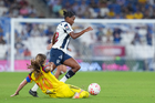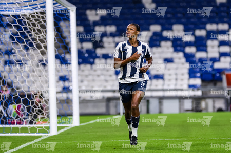 Guadalupe, Nuevo León, 6 de noviembre de 2025. Jermaine Seoposenwe en festejo de gol, durante el partido correspondiente a la ida de los Cuartos de Final del torneo Apertura 2025 de la Liga BBVA MX Femenil, entre las Rayadas del Monterrey y las Águilas del América, realizado en el estadio BBVA. Foto: Imago7/ Nora Guerrero