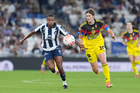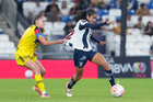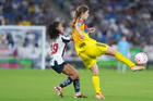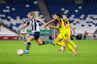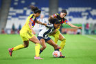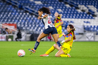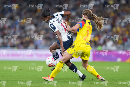 Guadalupe, Nuevo León, 6 de noviembre de 2025. Nicolette Hernández y Jermaine Seoposenwe, durante el partido correspondiente a la ida de los Cuartos de Final del torneo Apertura 2025 de la Liga BBVA MX Femenil, entre las Rayadas del Monterrey y las Águilas del América, realizado en el estadio BBVA. Foto: Imago7/ Andrea Jiménez