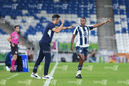 Guadalupe, Nuevo León, 6 de noviembre de 2025. Leonardo Álvarez, director técnico y Jermaine Seoposenwe, durante el partido correspondiente a la ida de los Cuartos de Final del torneo Apertura 2025 de la Liga BBVA MX Femenil, entre las Rayadas del Monterrey y las Águilas del América, realizado en el estadio BBVA. Foto: Imago7/ Andrea Jiménez
