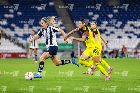 Guadalupe, Nuevo León, 6 de noviembre de 2025. Marcela Restrepo y Nicolette Hernández, durante el partido correspondiente a la ida de los Cuartos de Final del torneo Apertura 2025 de la Liga BBVA MX Femenil, entre las Rayadas del Monterrey y las Águilas del América, realizado en el estadio BBVA. Foto: Imago7/ Andrea Jiménez