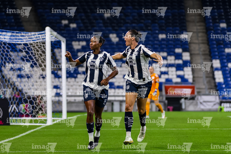 Guadalupe, Nuevo León, 6 de noviembre de 2025. Nancy Antonio e Irene Guerrero en festejo de gol, durante el partido correspondiente a la ida de los Cuartos de Final del torneo Apertura 2025 de la Liga BBVA MX Femenil, entre las Rayadas del Monterrey y las Águilas del América, realizado en el estadio BBVA. Foto: Imago7/ Andrea Jiménez