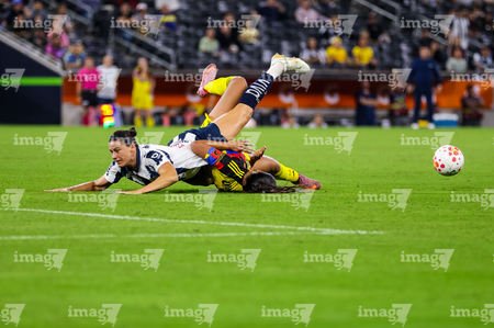 Guadalupe, Nuevo León, 6 de noviembre de 2025. Jermaine Seoposenwe y Nicolette Hernández, durante el partido correspondiente a la ida de los Cuartos de Final del torneo Apertura 2025 de la Liga BBVA MX Femenil, entre las Rayadas del Monterrey y las Águilas del América, realizado en el estadio BBVA. Foto: Imago7/ Andrea Jiménez