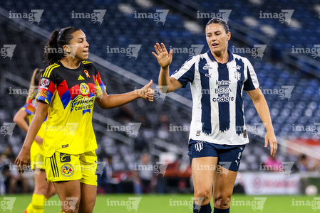 Guadalupe, Nuevo León, 6 de noviembre de 2025. Lourdes Bosch y Nicolette Hernández, durante el partido correspondiente a la ida de los Cuartos de Final del torneo Apertura 2025 de la Liga BBVA MX Femenil, entre las Rayadas del Monterrey y las Águilas del América, realizado en el estadio BBVA. Foto: Imago7/ Andrea Jiménez