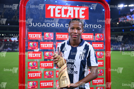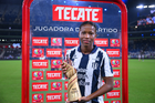 Guadalupe, Nuevo León, 6 de noviembre de 2025. Jermaine Seoposenwe recibió el trofeo Tecate a la jugadora del partido, durante el partido correspondiente a la ida de los Cuartos de Final del torneo Apertura 2025 de la Liga BBVA MX Femenil, entre las Rayadas del Monterrey y las Águilas del América, realizado en el estadio BBVA. Foto: Imago7/ Andrea Jiménez