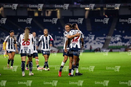 Guadalupe, Nuevo León, 6 de noviembre de 2025. Jugadoras de Rayadas en festejo de gol, durante el partido correspondiente a la ida de los Cuartos de Final del torneo Apertura 2025 de la Liga BBVA MX Femenil, entre las Rayadas del Monterrey y las Águilas del América, realizado en el estadio BBVA. Foto: Imago7/ Andrea Jiménez