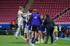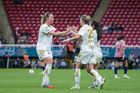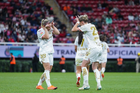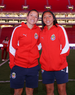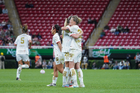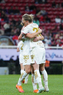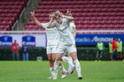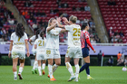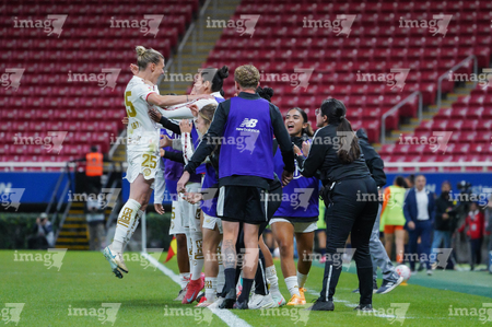 Zapopan, Jalisco, 6 de noviembre de 2025. Eugenie Le Sommer y Faustine Robert en festejo de gol, durante el partido correspondiente a la ida de los Cuartos de Final del torneo Apertura 2025 de la Liga BBVA MX Femenil, entre las Chivas Rayadas del Guadalajara y las Diablas Rojas del Toluca, realizado en el estadio Akron. Foto: Imago7/ Hugo Ramírez