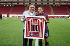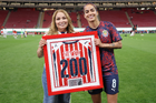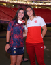 Zapopan, Jalisco, 6 de noviembre de 2025. Nelly Simón entregó un reconocimiento por 100 partidos a Carolina Jaramillo, durante el partido correspondiente a la ida de los Cuartos de Final del torneo Apertura 2025 de la Liga BBVA MX Femenil, entre las Chivas Rayadas del Guadalajara y las Diablas Rojas del Toluca, realizado en el estadio Akron. Foto: Imago7/ Juan Carlos Cubeyro.