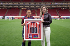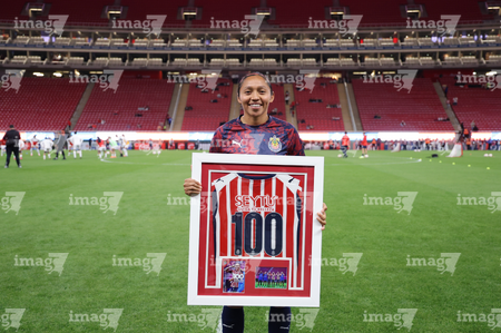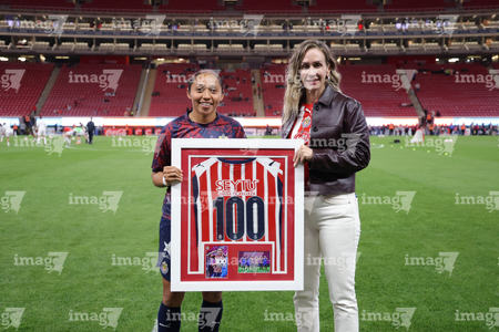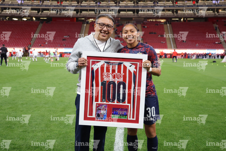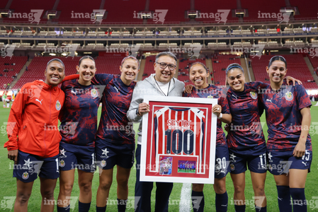 Zapopan, Jalisco, 6 de noviembre de 2025. Carolina Jaramillo recibió un reconocimiento por 100 partidos, durante el partido correspondiente a la ida de los Cuartos de Final del torneo Apertura 2025 de la Liga BBVA MX Femenil, entre las Chivas Rayadas del Guadalajara y las Diablas Rojas del Toluca, realizado en el estadio Akron. Foto: Imago7/ Juan Carlos Cubeyro.