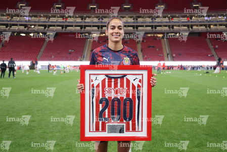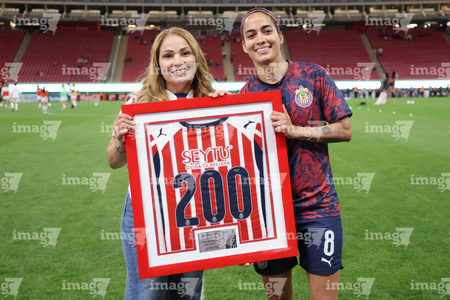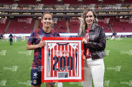 Zapopan, Jalisco, 6 de noviembre de 2025. Viridiana Salazar recibió un reconocimiento por 100 partidos, durante el partido correspondiente a la ida de los Cuartos de Final del torneo Apertura 2025 de la Liga BBVA MX Femenil, entre las Chivas Rayadas del Guadalajara y las Diablas Rojas del Toluca, realizado en el estadio Akron. Foto: Imago7/ Juan Carlos Cubeyro.