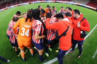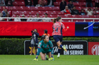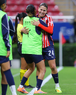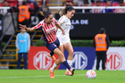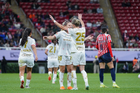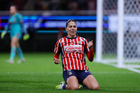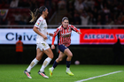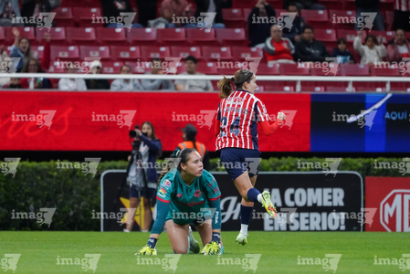 Zapopan, Jalisco, 6 de noviembre de 2025. Valeria Martínez recibe gol de penal, durante el partido correspondiente a la ida de los Cuartos de Final del torneo Apertura 2025 de la Liga BBVA MX Femenil, entre las Chivas Rayadas del Guadalajara y las Diablas Rojas del Toluca, realizado en el estadio Akron. Foto: Imago7/ Juan Carlos Cubeyro.