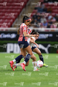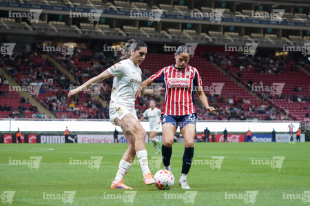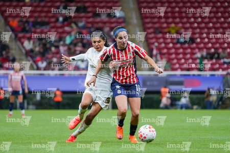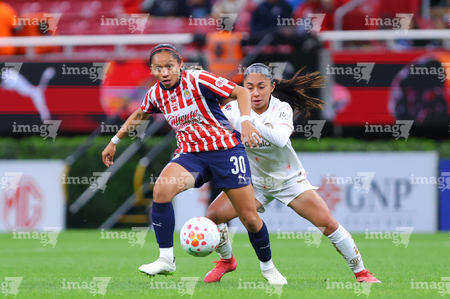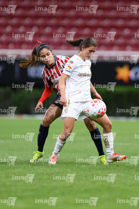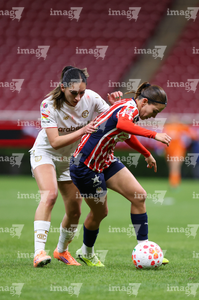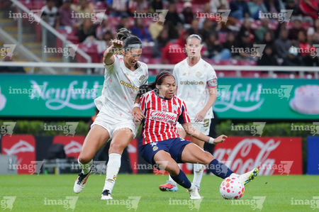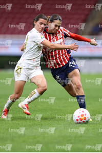 Zapopan, Jalisco, 6 de noviembre de 2025. Jazmín López y Denise Castro, durante el partido correspondiente a la ida de los Cuartos de Final del torneo Apertura 2025 de la Liga BBVA MX Femenil, entre las Chivas Rayadas del Guadalajara y las Diablas Rojas del Toluca, realizado en el estadio Akron. Foto: Imago7/ Juan Carlos Cubeyro.