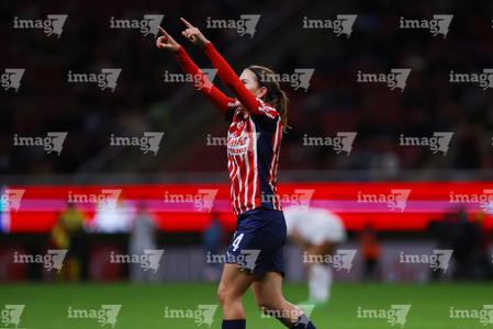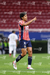 Zapopan, Jalisco, 6 de noviembre de 2025. Alicia Cervantes en festejo de gol, durante el partido correspondiente a la ida de los Cuartos de Final del torneo Apertura 2025 de la Liga BBVA MX Femenil, entre las Chivas Rayadas del Guadalajara y las Diablas Rojas del Toluca, realizado en el estadio Akron. Foto: Imago7/ Juan Carlos Cubeyro.