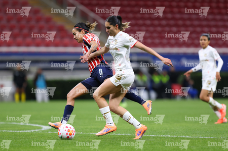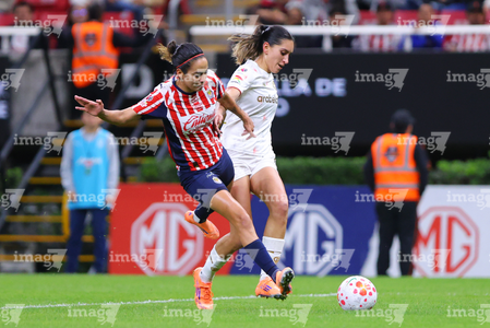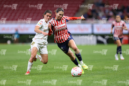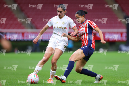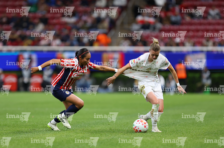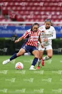 Zapopan, Jalisco, 6 de noviembre de 2025. Natalia Macías y Alicia Cervantes, durante el partido correspondiente a la ida de los Cuartos de Final del torneo Apertura 2025 de la Liga BBVA MX Femenil, entre las Chivas Rayadas del Guadalajara y las Diablas Rojas del Toluca, realizado en el estadio Akron. Foto: Imago7/Cristian Hernandez