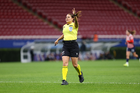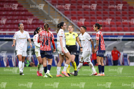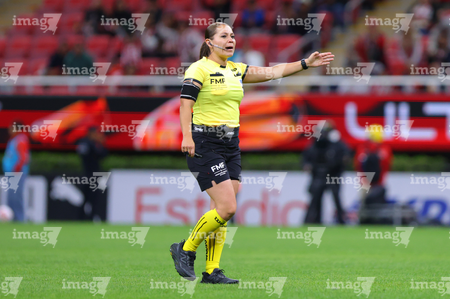 Zapopan, Jalisco, 6 de noviembre de 2025. Francia María González, árbitra central, durante el partido correspondiente a la ida de los Cuartos de Final del torneo Apertura 2025 de la Liga BBVA MX Femenil, entre las Chivas Rayadas del Guadalajara y las Diablas Rojas del Toluca, realizado en el estadio Akron. Foto: Imago7/ Juan Carlos Cubeyro.