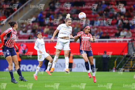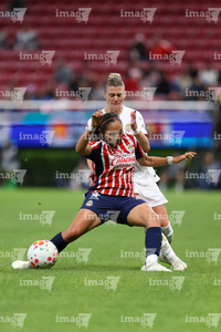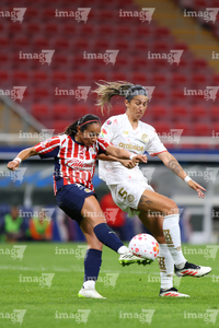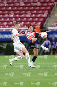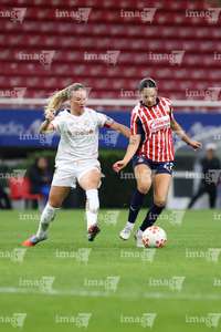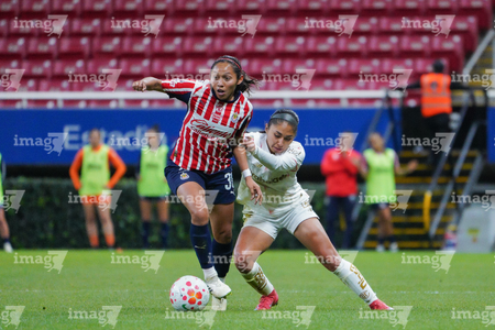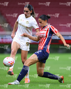 Zapopan, Jalisco, 6 de noviembre de 2025. Alicia Cervantes y Abby Erceg, durante el partido correspondiente a la ida de los Cuartos de Final del torneo Apertura 2025 de la Liga BBVA MX Femenil, entre las Chivas Rayadas del Guadalajara y las Diablas Rojas del Toluca, realizado en el estadio Akron. Foto: Imago7/ Juan Carlos Cubeyro.