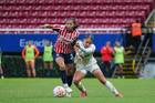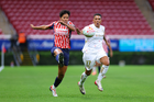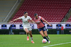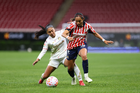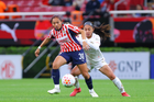 Zapopan, Jalisco, 6 de noviembre de 2025. Casandra Montero y Shanice Van De Sanden, durante el partido correspondiente a la ida de los Cuartos de Final del torneo Apertura 2025 de la Liga BBVA MX Femenil, entre las Chivas Rayadas del Guadalajara y las Diablas Rojas del Toluca, realizado en el estadio Akron. Foto: Imago7/ Juan Carlos Cubeyro.