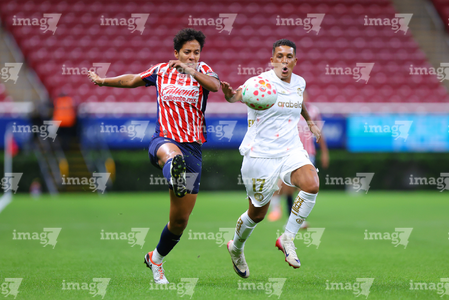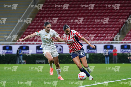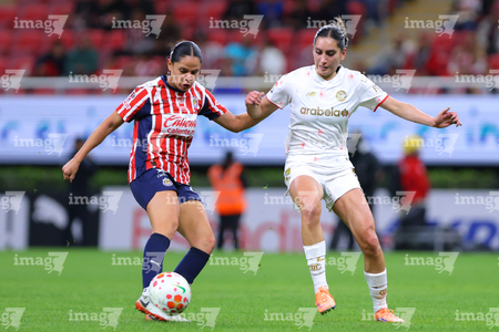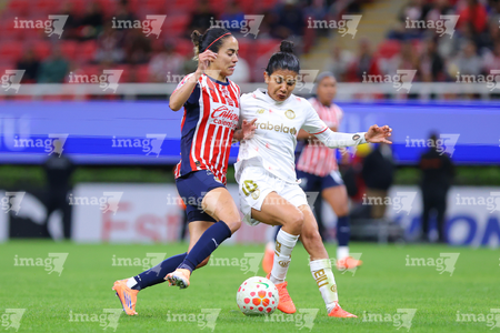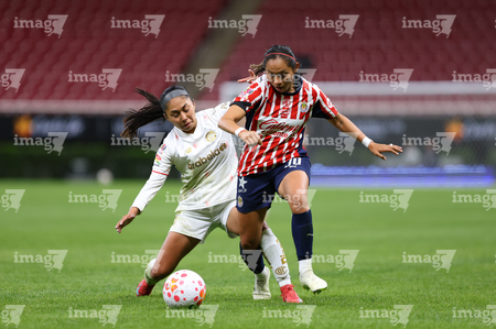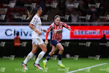 Zapopan, Jalisco, 6 de noviembre de 2025. Joselyn De La Rosa y Victoria López, durante el partido correspondiente a la ida de los Cuartos de Final del torneo Apertura 2025 de la Liga BBVA MX Femenil, entre las Chivas Rayadas del Guadalajara y las Diablas Rojas del Toluca, realizado en el estadio Akron. Foto: Imago7/ Juan Carlos Cubeyro.