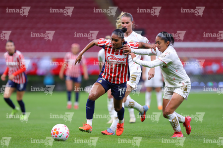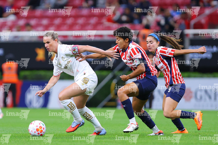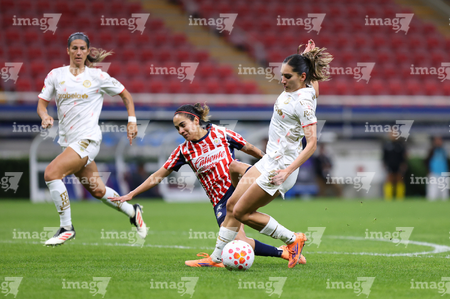 Zapopan, Jalisco, 6 de noviembre de 2025. Itzel Muñoz, Jazmín López y Diana Guatemala, durante el partido correspondiente a la ida de los Cuartos de Final del torneo Apertura 2025 de la Liga BBVA MX Femenil, entre las Chivas Rayadas del Guadalajara y las Diablas Rojas del Toluca, realizado en el estadio Akron. Foto: Imago7/ Juan Carlos Cubeyro.