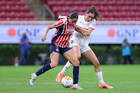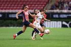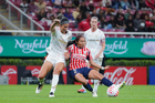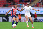 Zapopan, Jalisco, 6 de noviembre de 2025. Abby Erceg y Viridiana Salazar, durante el partido correspondiente a la ida de los Cuartos de Final del torneo Apertura 2025 de la Liga BBVA MX Femenil, entre las Chivas Rayadas del Guadalajara y las Diablas Rojas del Toluca, realizado en el estadio Akron. Foto: Imago7/ Hugo Ramirez