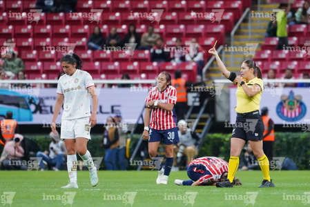 Zapopan, Jalisco, 6 de noviembre de 2025. Francia María González, árbitra central muestra tarjeta amarilla de amonestación, durante el partido correspondiente a la ida de los Cuartos de Final del torneo Apertura 2025 de la Liga BBVA MX Femenil, entre las Chivas Rayadas del Guadalajara y las Diablas Rojas del Toluca, realizado en el estadio Akron. Foto: Imago7/ Hugo Ramirez