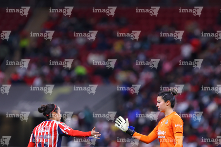Zapopan, Jalisco, 6 de noviembre de 2025. Carolina Jaramillo y Casandra Cuevas, durante el partido correspondiente a la ida de los Cuartos de Final del torneo Apertura 2025 de la Liga BBVA MX Femenil, entre las Chivas Rayadas del Guadalajara y las Diablas Rojas del Toluca, realizado en el estadio Akron. Foto: Imago7/ Juan Carlos Cubeyro.