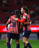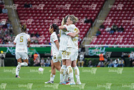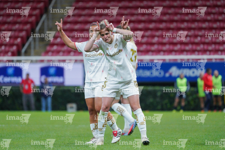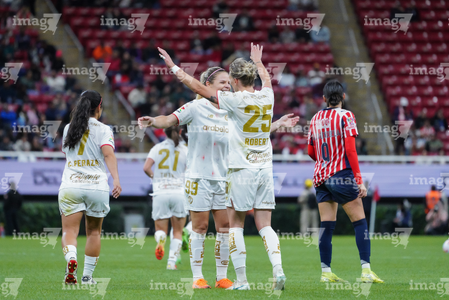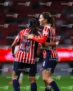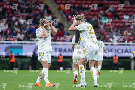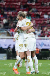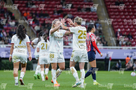 Zapopan, Jalisco, 6 de noviembre de 2025. Carolina Jaramillo y Alicia Cervantes en festejo de gol, durante el partido correspondiente a la ida de los Cuartos de Final del torneo Apertura 2025 de la Liga BBVA MX Femenil, entre las Chivas Rayadas del Guadalajara y las Diablas Rojas del Toluca, realizado en el estadio Akron. Foto: Imago7/ Juan Carlos Cubeyro.