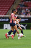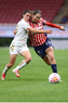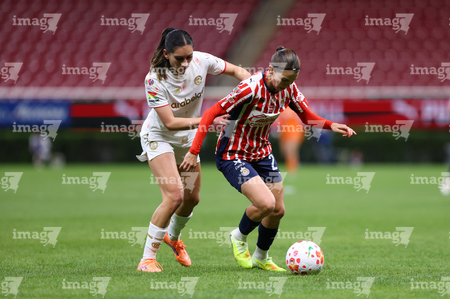 Zapopan, Jalisco, 6 de noviembre de 2025. Victoria López y Joselyn De La Rosa, durante el partido correspondiente a la ida de los Cuartos de Final del torneo Apertura 2025 de la Liga BBVA MX Femenil, entre las Chivas Rayadas del Guadalajara y las Diablas Rojas del Toluca, realizado en el estadio Akron. Foto: Imago7/ Juan Carlos Cubeyro.