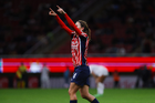 Zapopan, Jalisco, 6 de noviembre de 2025. Celeste Espino en festejo, durante el partido correspondiente a la ida de los Cuartos de Final del torneo Apertura 2025 de la Liga BBVA MX Femenil, entre las Chivas Rayadas del Guadalajara y las Diablas Rojas del Toluca, realizado en el estadio Akron. Foto: Imago7/ Juan Carlos Cubeyro.