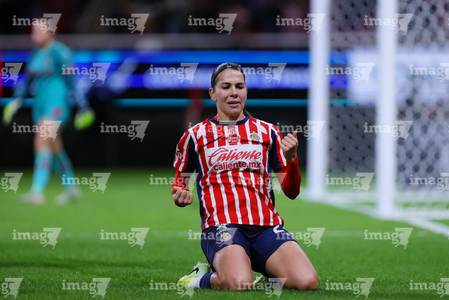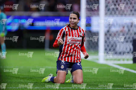 Zapopan, Jalisco, 6 de noviembre de 2025. Alicia Cervantes en festejo de gol, durante el partido correspondiente a la ida de los Cuartos de Final del torneo Apertura 2025 de la Liga BBVA MX Femenil, entre las Chivas Rayadas del Guadalajara y las Diablas Rojas del Toluca, realizado en el estadio Akron. Foto: Imago7/