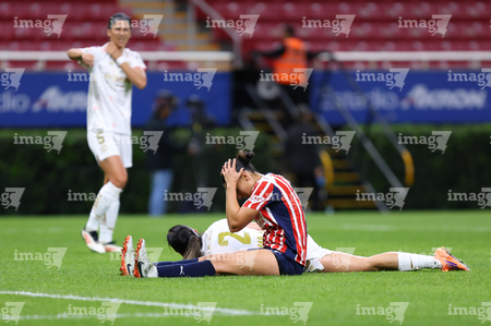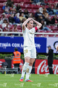 Zapopan, Jalisco, 6 de noviembre de 2025. Denise Castro en lamento, durante el partido correspondiente a la ida de los Cuartos de Final del torneo Apertura 2025 de la Liga BBVA MX Femenil, entre las Chivas Rayadas del Guadalajara y las Diablas Rojas del Toluca, realizado en el estadio Akron. Foto: Imago7/Cristian Hernandez