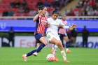 Zapopan, Jalisco, 6 de noviembre de 2025. Eugenie Le Sommer y Damaris Godínez, durante el partido correspondiente a la ida de los Cuartos de Final del torneo Apertura 2025 de la Liga BBVA MX Femenil, entre las Chivas Rayadas del Guadalajara y las Diablas Rojas del Toluca, realizado en el estadio Akron. Foto: Imago7/ Juan Carlos Cubeyro.