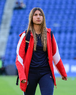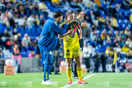 Ciudad de México, 16 de noviembre de 2025. Angel Villacampa, director técnico y Bruna Vilamala, durante el partido correspondiente a la vuelta de las Semifinales del torneo Apertura 2025 de la Liga BBVA MX Femenil, entre las Águilas del América y las Chivas Rayadas del Guadalajara, realizado en el estadio Ciudad de los Deportes. Foto: Imago7/ Mauricio Ruiz