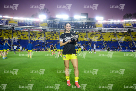 Ciudad de México, 16 de noviembre de 2025. Scarlett Camberos recibió un reconocimiento, durante el partido correspondiente a la vuelta de las Semifinales del torneo Apertura 2025 de la Liga BBVA MX Femenil, entre las Águilas del América y las Chivas Rayadas del Guadalajara, realizado en el estadio Ciudad de los Deportes. Foto: Imago7/ Alexis Chávez
